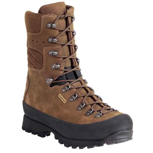 Kenetrek Men's Mountain Extreme 10in Waterproof Hunting Boots - When you're hunting Dall Sheep in the Mackenzie Mountains of the Northwest Territories, you may be surprised with six inches of snow in August. Others may wait it out in the tent, but your Extremes give you the wherewithal to continue hunting no matter what. There's nothing tougher than high altitude sheep hunts and no boot tougher and more comfortable than these. 10in tall 2.8mm thick premium full grain leather uppers with one piece vamp construction with no seams down the tongue for abrasion resistance and waterproofness Reinforced double and triple stitching 7mm nylon midsoles for extra support with pack loads Boot hardware that swivels instead of breaking Reinforced rubber sole guard for extra abrasion resistance Windtex waterproof breathable flexible membrane Lightweight K-Talon outsoles provide excellent traction Style: KE-420-NI