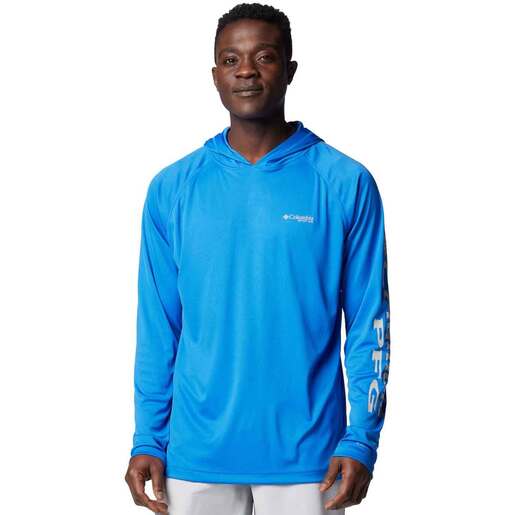 Columbia Men's PFG Terminal Tackle Hooded Long Sleeve Fishing Shirt - This classic sun hoodie is made for long days on the water with broad-spectrum UV protection, sweat-wicking tech, and quick-drying fabric for comfort from first light to last cast. Omni-Shade broad spectrum UPF 50 protects against skin damage using select fibers and fabrics to block a wider range of UVA/UVB rays Omni-Wick keeps you dry and cool by pulling moisture to the fabric’s surface to evaporate, delivering fast-drying, next-to skin comfort in the heat Quick-drying treatment allows garments to dry faster by helping moisture escape from the surface of fabric Lightweight hood keeps the back of your neck and ears protected from the sun when pulled up Raglan sleeves for a full range of motion while casting Center back length: 29in Style: 1536171