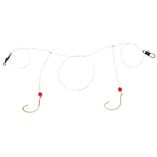 Sea Striker Pompano Rig-Double Wide Gap Hooks -Tied on 25 lb. mono with gold Kahle-style hooks highlighted with a fluorescent red bead, a black swivel at the top and black sinker at the bottom. Individually packaged. Individually packagedTied on 25 lb. mono with gold Kahle-style hooks A red bead, a black swivel at the top and black sinker at the bottomMPN: DPR