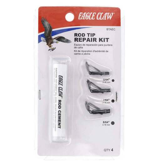 Eagle Claw Rod Tip Repair Kit With Glue - Everything you need to fix your broken rod tip. 3 rod tips and cement to secure the rod tip to the rod. Rod tip sizes include: 6/64in, 7/64in, 8/64in.