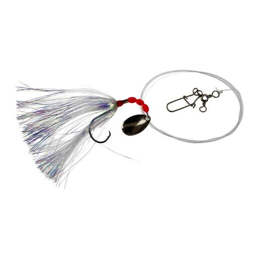 Eagle Claw Circle Sea Spinner Fluke Bait Rig - 41in pearl flashabou, silver blade, 3-way swivel, with dual lock snap and red beads MAIN LINE TYPE: Clear Monofilament MAIN LINE DIAMETER: .028in WATER TYPE: Saltwater FINISH/PLATING: Platinum Black Plus HOOK: Octopus Circle Prop 65 Warning