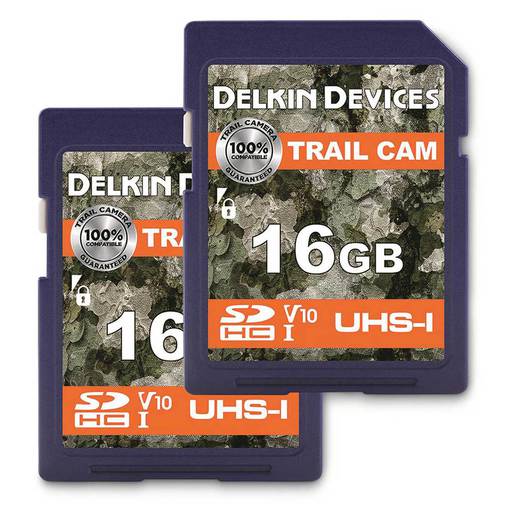 Delkin Devices 16GB Trail Cam SDHC Memory Card (Class 10) - 2pk - Designed specifically for trail cameras and other handheld devices, these Delkin Devices 16GB SD Memory Cards will satisfy all of your digital storage needs. Memory Cards are waterproof and shockproof, and will support full HD 1080p video recordings, along with JPEG and RAW still photography. Includes (2) 16GB SD memory cards. 16GB memory size Optimized for trail cameras, DSLRs, GPS units, fish finders, and other handheld units Supports full HD 1080p video recording JPEG + RAW still photography ready Waterproof, shockproof, and dustproof design UHS-I/V10/U1/Class 10 Includes (2) 16GB SD memory cards Key Specifications Max Write Speed: 30MB/s Min Write Speed: 10MB/s