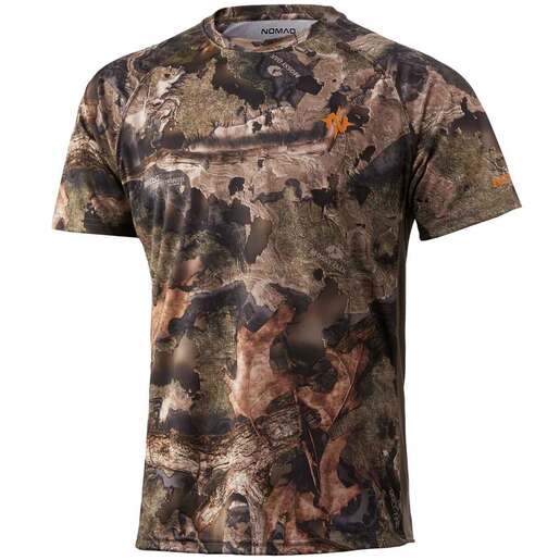 Nomad Men's Mossy Oak Droptine Pursuit Short-Sleeve Hunting Shirt - This is a lightweight crew neck shirt that is ideal for layering on cool days or by itself when it's hot. Sun protection +UPF 30 to block UVA and UVB rays Stain resistant Anti microbial treatment Superior breathability 90% Polyester/10% Spandex Style: N1200036