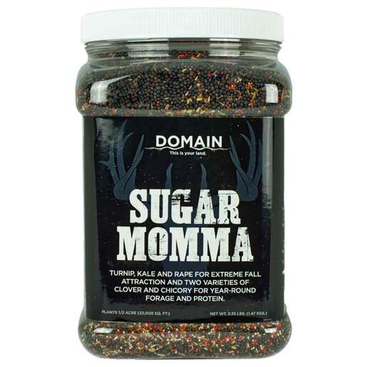 Domain Outdoor Sugar Momma Deer Food Plot Mix - Finally, a food plot mix that does it all, sugar momma provides a premier cold season food plot with varieties of turnip, rape and kale for extreme fall and winter attraction and two varieties of clover and chicory to add year-round forage and protein. With one planting sugar momma is designed to provide food on a year-round basis with brassicas intended for fast growth and cold season forage and perennials designed for year-round high protein forage. No matter the season sugar momma provides the goods. Sugar momma can last up to 3+ years and is the perfect food plot choice if you have one food plot on your property that needs to handle graze pressure, attract deer and feed them year round. Nothing provides more bang for your buck than sugar momma. Plant Varieties: Turnip, Rape, Kale, Clovers, Chicory PH Range: 6-7 Soil Type: Well-Drained, Dark/Rich, Sandy, Rocky, Clay-Based