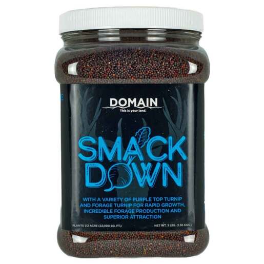 Domain Outdoor Smack Down Deer Food Plot Mix - A fantastic fall and winter food source, smack down offers two varieties of turnips that are easy to grow and fast to mature. Not only will this grow rapidly, but the dual-purpose mix produces a large purple spherical root and leafy forage that can both be grazed, providing high levels of protein and energy. This combination makes smack down one of the most popular food plots you can plant for whitetail deer. These two varieties of turnip were carefully selected to provide you both warm and cold season food options and offer attractive forages no matter the temperature or time of year - it's truly an all fall hunt plot. Plant Varieties: Two Types Of Turnip PH Range: 5.8-7 Soil Type: Well-Drained, Dark/Rich, Sandy, Rocky, Clay