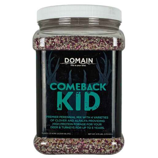 Domain Outdoor Comeback Kid Deer And Turkey Food Plot Mix - Loaded with a mixture of cold season perennials and annuals, this protein-rich, tonnage producing clover mix is designed for year-round food production and attraction for deer and turkey. By combining special varieties of clover and alfalfa we have created a perennial mix that will establish quickly and last up to 5 years. Comeback kid contains 4 special varieties of clover and 1 variety of alfalfa to create an absolute deer magnet providing forages with protein levels above 30%. When your clover plants begin to flower it signals their maturity, making it a great time to mow the plot down to 6-8in. Periodic mowing helps eliminate unwanted weeds and generates re-growth of the clover and alfalfa, keeping them strong and healthy. It's during this growth stage that your comeback kid food plot will provide the highest level of nutrition and deer activity. Comeback kid is designed to be the foundation of your food plot program, as it provides the backbone of deer nutrition with it's high protein forages, will be the first to germinate in the spring and is extremely cold tolerant into the dead of a northern winter, comeback kid can play an integral role in the health of your herd and the success of your food plot program. Plant Varieties: 4 Varieties Of Clover, 1 Variety Of Alfalfa Soil Type: Dark/Rich, Loam, Sand, Moist Soil PH Range: 6-7