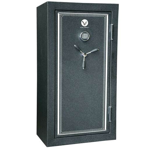 Vital Impact 42 Gun Safe - Black - This 42 gun safe is equiped with a programmable digital lock and has a 45 minute fire rating @ 1200°F. This is a perfect solution for any enthusiast who wants to keep their gun collection "Safe." 42 Gun Capacity Dimensions: 55in H x 29in W x 20in L 45 min @1200°F Fire Rating California DOJ Approved