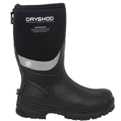 Dryshod Men's Steadyeti Waterproof Vibram Mid Top Pull On Boots - Superior waterproof protection from extreme-cold and icy conditions featuring an extra-rugged super grip outsole! Genuine direct-attach Vibram “Hellcat” Arctic Grip outsole with oversized grip pods for extra-steady footing on ice and snow. Super cold-blocking bootie construction comprised of extra Densoprene undulating foam, laminated with1.5mm breathable airmesh + non-pilling fleece inner lining. Full-foot 2mm Densoprene sub-sole for added cold blocking protection from the ground up. Reinforced heel, toe, ankle, and instep. Extra-large 3M reflective side-stripe provides long-range visibility to on-coming traffic in low light or night-time conditions. Premium contour-moulded EVA sockliner provides all-day comfort and added cold-blocking protection. Easy-On/Off convenience with moulded-on heel kick for quick hands-free removal. Full-foot reinforced truck board with protective steel shank. Exclusive HYDROKOTE textile treatment repels water, snow and ice on contact. 100% Waterproof Style: SYT-MM