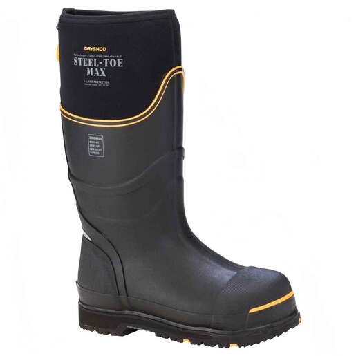 Dryshod Men's Steel-Toe Max Waterproof Hunting Boots - Extreme-Cold Conditions Protective Work Boot. Safety matters! Steel-toe protection and all-day comfort! Now with extra layers of protection provide unsurpassed warmth on the coldest days! Solid Rubber, long-wearing outsole for traction and durability Special broad-toe last – 3 mm extra space ANSI-rated steel toe for safety Meets ASTM F2413-11 M I/75 C/75 EH Rigid triple-layer toe and heel reinforcements Yellow treatments to indicate safety 6 layers of protection plus EVA cold-blocking midsole 5.5 mm bootie + 2.5 mm DENSOPRENE XD foam (extreme density) for extra protection + 2 mm airmesh + 2 mm warm fleece lining = 11 mm of insulating warmth and protection Removable molded EVA sockliner Double achilles heel and instep reinforcement for comfort and protection Features unisex sizing Steel shank for added arch support 100% Waterproof Style: STM-UH