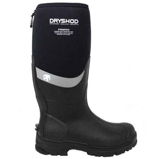 Dryshod Men's Steadyeti Waterproof Vibram Arctic Grip Hunting Boots - Superior waterproof protection from extreme-cold and icy conditions featuring an extra-rugged super grip outsole! Genuine direct-attach Vibram “Hellcat” Arctic Grip outsole with oversized grip pods for extra-steady footing on ice and snow. Super cold-blocking bootie construction comprised of extra Densoprene undulating foam, laminated with1.5mm breathable airmesh + non-pilling fleece inner lining. Full-foot 2mm Densoprene sub-sole for added cold blocking protection from the ground up. Reinforced heel, toe, ankle, and instep. Extra-large 3M reflective side-stripe provides long-range visibility to on-coming traffic in low light or night-time conditions. Premium contour-moulded EVA sockliner provides all-day comfort and added cold-blocking protection. Easy-On/Off convenience with moulded-on heel kick for quick hands-free removal. Full-foot reinforced truck board with protective steel shank. Exclusive HYDROKOTE textile treatment repels water, snow and ice on contact. 100% Waterproof Style: SYT-MH