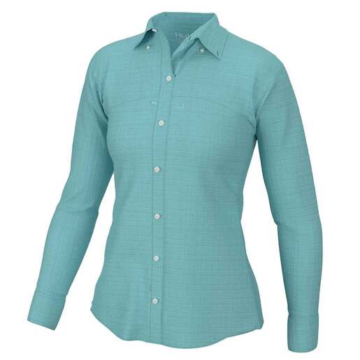 Huk Women's Tide Point Cross Dye Long Sleeve Fishing Shirt - Designed to keep you comfortable so you can be out longer. 100% Polyester Two zippered chest pockets Sunglass holder and wipe Pleated back panel Perforated back for breathability Hidden collar snaps Roll up button sleeves Style: H6150003