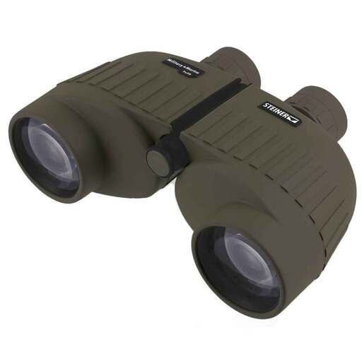 Steiner Military Marine Full-Size Binoculars - 7x50 - The Military-Marine binocular is adapted for rugged all-around use. It is light and easy to handle, with bright images and a wide field of view for steady viewing, even on the move. The floating prism system uses flexible silicone lens mount to absorb severe shock, impact and abuse without damage, while the Sports-Auto Focus System lets you focus each eyepiece to your vision once, then keeps images razor sharp from 20 yards to infinity. The Military-Marine features a Markolon housing, a durable polycarbonate with NBR Long Life rubber armoring, creating a lightweight, rugged chassis that withstands 11 Gs of impact. Includes standard neck strap, objective covers, rain protection cap and carry case.