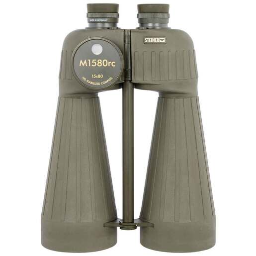Steiner M1580 Rangefinding Binoculars & Compass - 15x80 - The Steiner M1580 Reticle & Compass is for visual efficiency, extended-viewing comfort and object detail. Traditional spotting scopes cant compare to these high power military binoculars. Originally developed for perimeter and border patrol applications, they now serve military and law enforcement agencies around the world. The massive 80mm objective lenses and unmatched Steiner quality deliver far superior low-light performance and image acuity for artillery teams, SEAL missions, surveillance missions, air traffic controllers, forest fighters and naval patrols. Integrates a large HD stabilized compass for accurate bearings, fluid damped to eliminate degree variance while underway in a vehicle or ship. Features a versatile ranging reticle found on all "r" models that be used to judge both the height and distance to a target. Floating Prism System uses flexible silicone lens mount to absorb severe shock, impact and abuse without damage, Multi-Coated Optics are state-of-art for brighter picture, higher contrast and sharply contoured images with natural color definition, Sports-Auto Focus System lets you focus each eyepiece to your vision once, then keeps images razor sharp from 20 yards to infinity, Makrolon housing is durable polycarbonate with NBR Long Life rubber armoring, creating a lightweight, rugged chassis that withstands 11 Gs of impact. Includes tripod mount, neck strap, objective cover and rain protection cap.
