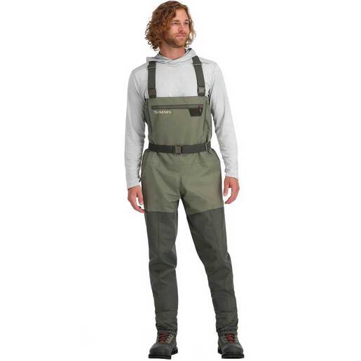 Simms Men's Tributary Fishing Waders - The best value in wading, the Tributary collection from Simms features every ounce of Simms' high-performing wader DNA in an affordable package. Breathable & comfortable waterproof polyester 3-layer upper & 4-layer lower. Reach-through fleece lined hand-warming pocket, with zippered top stash pocket and integrated fly patch Single rear belt loop with non-stretch wading belt Built-in Gravel Guards with a gathered elastic bottom hem Anatomically engineered neoprene stocking feet with an anti-microbial finish Flip-out chest accessory pocket sewn-in Style: 13615
