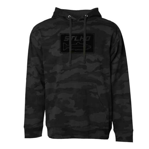 STLHD Men's Black Water Logo Fishing Hoodie - The STLHD Black Water hooded sweatshirt is the ultimate in understated black on black design. 80% Cotton / 20% Polyester Ultra Soft fleece lined Jersey-lined hood Split stitch, double-needle sewing on all seams Ribbed cuff and waistband Metal eyelets and generous hood pulls 241g mid/heavyweight Style: STLHD-0458