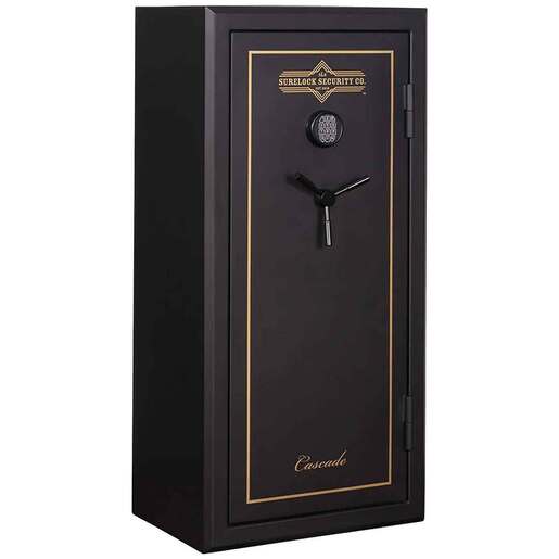 SureLock Security Company Cascade 24 Gun and Home Safe - Black Texture - Surelock Security Company’s Cascade 24 Gun and Home Safe provides an affordable security solution for your firearms and valuables. Crafted with 14-gauge steel and a 30-minute fire rating (at 1400°F), this safe provides additional protection should the unexpected occur. Standing 55in tall, 26in wide, and 20in deep, the Cascade 24 is the perfect utilitarian, mid-size safe for securing your most prized possessions. The exterior is powder coated with a black, textured finish and has a 3-spoke handle and digital lock (with key backup) for easy, reliable access. The Cascade 24 can hold up to 24 long guns, plus additional smaller firearms. The 3 adjustable shelves allow you to customize the interior as you see fit. The interior door panel organizer provides even more storage space for smaller items - like keys and jewelry or handheld firearms. With 4 active 1in steel bolts and 4, 1in steel deadbolts, the Cascade 24 offers additional security and peace of mind - without breaking the bank. Backed by Surelock Security's Lifetime Replacement Program, the Cascade 24 Gun and Home Safe provides rugged, dependable protection - safely securing your valuables and firearms. Features Exterior cubic feet: 4.58 3 adjustable shelves Dual gun racks Beveled edges Interior door panel organizer 1in bolt size 8 locking bolts (4 active, 4 dead) Color: black texture 3-spoke handle Weighs: 302 lb.