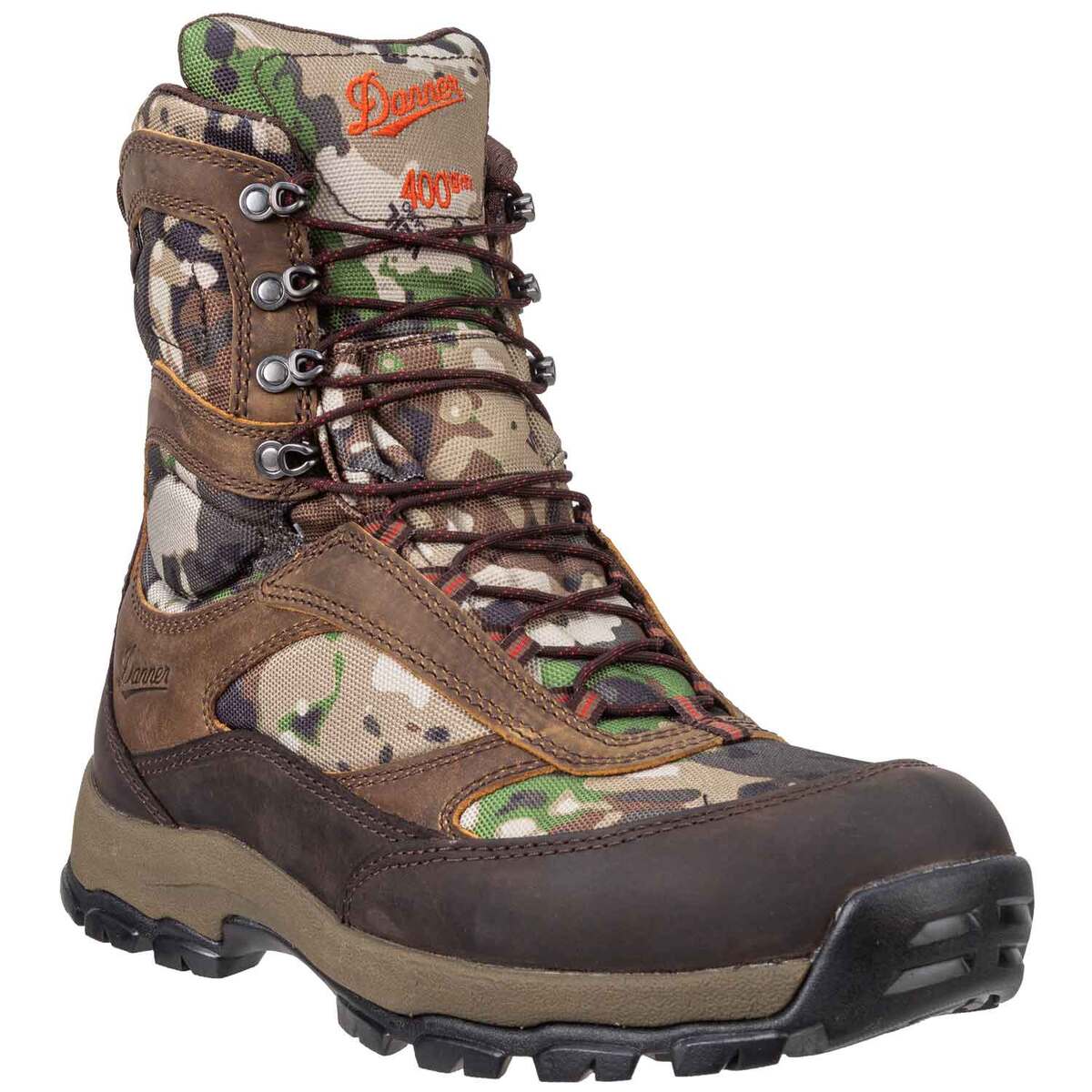 Danner Men's High Ground 8in 400g Insulation Waterproof Hunting Boots - This boot is built to allow hunters to hunt longer with less foot fatigue, hunt faster and quieter as they track their prey and maintains the longevity and durability that is demanded out of every product that bears the mark of Danner. Nubuck oiled Leather upper, 9000 Denier Nylon 400g Thinsulate insulation GORE-TEX waterproof, breathable lining Cement construction to reduce the weight while still integrating an aggressive outsole Lock and Load lacing system Lightweight and flexible Athletic fit that provides a tighter heel pocket with a wider toe box for more flexibility and less weight Durable rubber outsole for traction over a variety of terrain Veil Summit camo pattern overlay throughout the boot 8in Height Style: 46252