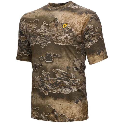 Blocker Outdoors Men's Realtree Excape Fused Cotton Short-Sleeve Hunting Shirt - The Shield Fused Cotton tee is lightweight, soft, durable, and ready to take on everything from pre-season work to seasonal hunts. Durable 60% Cotton / 40% Polyester blend S3 anti-microbial finish prevents odors Rib knit neck Style: 1060114
