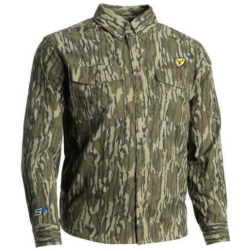 Blocker Outdoors Men's Mossy Oak Bottomland Fused Cotton Rip-Stop Long Sleeve Hunting Shirt - The Shield Fused Cotton shirt features a lightweight yet durable ripstop poly/cotton fabric, ready to take on everything from pre-season work to seasonal hunts. Durable 60% Cotton / 40% Polyester rip-stop fabric S3 anti-microbial finish prevents odors Classic button up design Chest pockets for stashing gear Style: 1060115