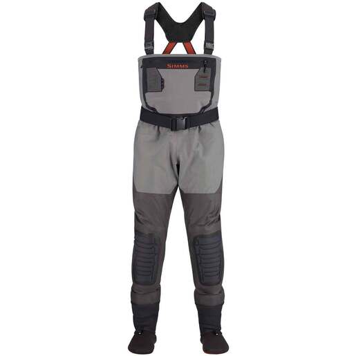 Simms Men's Confluence Stockingfoot Fishing Waders - Designed for anglers who work all the angles, the Confluence Stockingfoot provides the perfect balance of rugged durability, freedom of movement, and intuitive on-water storage through proprietary material technology and a feature set that's ready to fish. Proprietary 4-layer polycarbonate Toray lower for maximum durability and abrasion resistance Stretch 4-layer Toray upper for enhanced mobility Adjustable spacer air-mesh suspender system with a fabric suspender divider and integrated webbing attach point for net carry Top access zippered stretch pocket plus zippered, reach-through micro-fleece lined hand-warming chest pocket Tool docking stations built into integrated loop patches on wader front chest Pocket Built-in low-profile back belt loops with high and low options 2in stretch nylon belt included Compression-molded neoprene knee constructioin provides additional protection while kneeling and brush-busting Abrasion-resistant, built-in Gravel Guards Anatomically engineered neoprene stockingfeet with anti-microbial finish Style: 13598