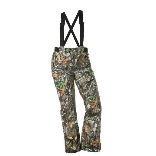 DSG Outerwear Women's Realtree Edge Addie Hunting Pants - The Addie Bib/Pant is a quiet brushed waterproof/windproof fixed insulation pant. Quiet brushed tricot fabric The Realtree camo pants with suspenders have fully taped seams with DWR treatment to shed water from the fabric 120 grams of Polyfil insulation Removable suspenders Adjustable inseam: 32.5in to 28.5in Women's camo hunting pants with suspenders and adjustable waist tabs Late Season Style: 98822