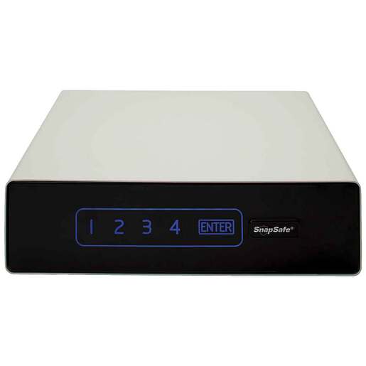 SnapSafe GlideVault 1 Gun Pistol Safe - Silver - The SnapSage GlideVault spring assisted slide-out drawer accommodates handguns, jewelry, documents and other valuables. Features a tempered glass touchpad with silent mode which can be programmed with a 4 to 6 digit access code; pry resistant door keeps children and unauthorized users from gaining access; exterior housing is constructed of 16 gauge steel with two internal hardened locking lugs; anchor to stationery objects with included 5 foot cable; permanently install using the pre-drilled housing and a micro-USB port for backup access. Barrel key for access. Uses four AAA Batteries (Not Included).