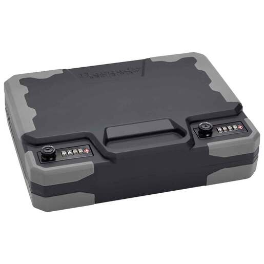 Hornady 95260 TrekLite Lock Box XXL Combination/Key Entry - Black - Hornady Treklite Lock Box XXL protects firearms, ammo and other valuables while traveling or at home. Featuring dual four Digit TSA lock that offers advanced security and 10,000 user programmable codes; advanced, impact-resistant polycarbonate for exceptional toughness; fits up to two full-sized 1911 handguns; durable, non-slip rubber over mold provides added impact protection and stability. Sized to fit 8.5in x 11in documents. Includes 1500lbs rated security cable with patented cable connector that maximizes cargo space.