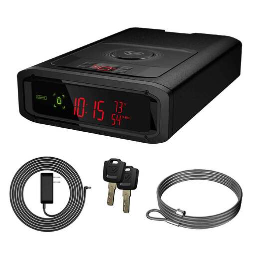 Vaultek Smart Station - DS2i - The ultimate modern home safe has arrived. Fully loaded with top of the line modern upgrades; top mounted wireless charging pad, USB/USB-C accessory charging ports, and a sleek customizable LED display. Combine these features with industry leading safe technology, Vaultek's signature fit and finish, and intelligent new design, the next generation smart safe is here. This is the Vaultek Smart Station. NEXT GENERATION SMART SAFE Modern upgrades with a top mounted wireless charging pad, USB/USB-C accessory charging ports, and a sleek customizable LED display showing time/temperature/humidity make the ultimate modern home safe. Low profile safe design blends into its environment, great for RVs or nightstands. The auto-open safe drawer can secure a full size pistol (up to 9"), jewelry, small documents, and other personal belongings. EXTERIOR DIMENSIONS: 12.125" x 8.25" x 3" INTERIOR DIMENSIONS: 9" x 7.5" x 1.5" BUILT-IN BIOMETRIC SCANNER Quick, secure access using the LED backlit HD fingerprint scanner, Smart Sense digital keypad, or Nano Key 2.0 (sold separately). PRECISION BALL BEARING TWIN RAIL SYSTEM automatically deploys the safe open quickly with smooth and silent action. BUILT-IN LED INTERIOR LIGHT illuminates the interior. BLUETOOTH 2.0 Manage and monitor safe activity from your smartphone. View history log, check for tampering, and customize safe settings. The Bluetooth 2.0 app provides a highly interactive experience from your smartphone within Bluetooth range of the safe. Bluetooth can be toggled on/off as desired. ANTI-THEFT FEATURES Signature anti-impact latch design, anti-pry construction, and included HD steel security cable can tether the safe in place. Safe can detect tampering and activate a security sleep mode if multiple wrong codes are entered or unrecognized fingerprints scanned. Accessory mounting plates sold separately for hard mounting in place. BUILT-IN BACKUP BATTERY Safe is powered by AC power adapter (included) and needs to be left plugged in. In the event of a power outage, a built-in battery provides short term backup power. Manual backup keys are included. (2) Manual Keys AC Power Adapter 4 ft. Steel Security Cable