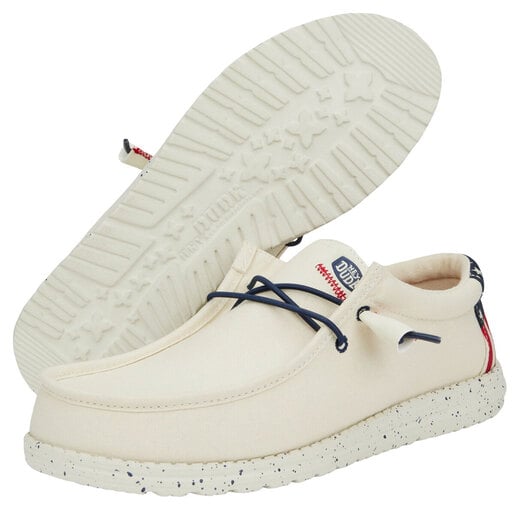Hey Dude Men's Wally Americana Casual Shoes - Stars and stripes meet free-roaming, HEYDUDE comfort in the Wally Americana, complete with easy-on and -off laces, a printed sock liner, and cushioned foam under every step. Textile upper Comfort cushioned ankle collar Easy-on lace system Removable foam insole Lightweight flexible outsole Style: 40687