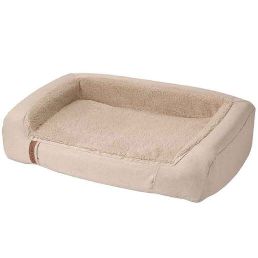 Orvis RecoveryZone FleeceLock Couch Dog Bed - The new RecoveryZone FleeceLock Couch Dog Bed offers innovative support and a cozy cover that won't pill, pull, or shed. Satisfies all sleep styles: your dog will love to stretch, curl, or lean in this best-selling shape Three-sided bolster is made with solid, full-height foam pieces so it’ll never flop over Bolster gives your dog a sense of security while an open side makes it easier for them to get on and off Two solid foam layers combine to distribute weight, increase circulation, and reduce pressure points on joints and muscles, helping your dog recover faster Temp-regulating, responsive 1" Serene Foam top layer promotes airflow and enhances breathability Pioneering dual-foam construction gives your dog the best of both worlds: immediate comfort and long-term support Supportive 4" base is made with low-VOC CertiPUR-US foam Compressed for easy-ship convenience—quick & clear assembly instructions included Soft sherpa fleece helps your dog feel cozy and secure Backed by Orvis FleeceLock Promise: Guaranteed to never pull or pill and you’ll never find a bare spot Easy to move with hidden no-chew handles Water-resistant, eco-friendly liner protects the foam and is made from 100% post-consumer recycled polyester Machine washable cover with a faux-leather tag makes cleanup easy Made with 90% post-consumer recycled polyester and 10% virgin polyester
