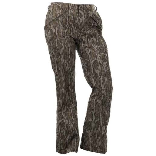 DSG Outerwear Women's Mossy Oak Bottomland Nova Hunting Rain Pants - The Nova rain pant is a lightweight technical pant, perfect to pack up and take along on any adventure. Lightweight technical stretch fabric with 10,000mm MVT/10,000g/m Waterproof breathable membrane, finished with DWR treatment to shed water on the face of the fabric Fully seal-taped seams YKK zippered pockets and side leg zippers Extra wide center back belt loop Elastic panels on sides of waistband for added comfort Adjustable inseam from 33.5in to 29.5in Style: 514304