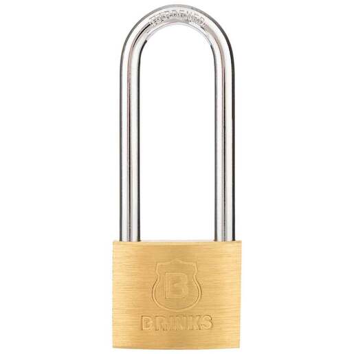 Brinks 40mm Brass Keyed Pad Lock - Brink’s Brass Padlock features a 40mm body and a long chrome plated, hardened steel shackle for increased cut resistance. It is equipped with a pin brass tumbler cylinder and double brass bolt locking mechanism for pick resistance. With corrosion-resisting properties, brass is perfect for use indoors and outdoors. The padlock is Ideal for all types of usages such as locking and securing lockers, storages, garages, and tool boxes. Features Shackle Clearance is 2.5in Strength - Steel shackle has a cut Strength up to 2800 lbs. Quality You Can Trust - A global leader in Security-related products and services, the Brink's name is synonymous with top quality products to keep you and your belongings safe.