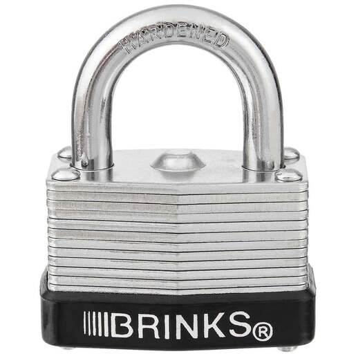 Brinks 40mm Laminated Steel Keyed and Warded Padlock - Brink’s Laminated Steel Warded Padlock features a 40mm body and a chrome plated, hardened steel shackle for increased cut resistance. The warded lock is designed with a single locking lever mechanism and prevents jamming from dirt and other particulates. A form-fitted plastic bumper completes the look, offering protection from marring. The padlock is perfect for indoors and outdoors and is ideal to secure storage units, chains, trailers, gates, and utility boxes. Features Strength - Steel shackle has a cut Strength up to 2400 lbs. Quality You Can Trust - A global leader in Security-related products and services, the Brink's name is synonymous with top quality products to keep you and your belongings safe.