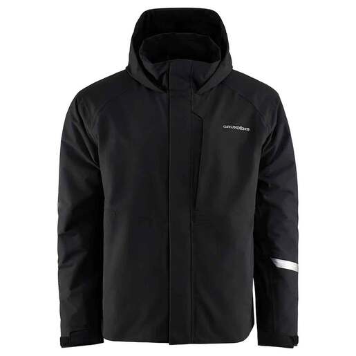 Grundens Men's Transmit X Waterproof Fishing Jacket - This best-in-class Transmit X jacket was built with the open water bass and lake angler in mind. Designed for early morning take-offs, 70mph runs across the lake, and wind-driven downpours. Placketed center front zipper construction offers protection from wind-driven rain 2 fleece-lined handwarmer pockets with zippered closures Internally-routed shock cords on hood adjustment for a custom fit to the wearer's preference Dunkable neoprene wrist cuffs to prevent water from penetrating up sleeves Reflective logos and visibility striping for low-light visibility 100% nylon 15k/10k waterproof/breathable performance Style: 10214