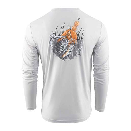 Grundens Men's Poppin' South Tech Long Sleeve Fishing Shirt - Highlighting the classic live shrimp under a popping cork rig well known throughout the Gulf Coast from Texas through Louisiana. Large graphic on back Small Grundens logo on the front Style: 50428