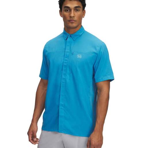 Under Armour Men's Fish Pro Hybrid Woven Short-Sleeve Fishing Shirt - On or off the water, you'll wear this gear. It's light, stretchy, dries quick—oh, and it's ridiculously comfortable too. Lightweight stretch woven fabric delivers superior comfort & durability Strategic mesh panels for added breathability where you need it most Stain release materials keep dirt from soaking in UPF 50+ protects you from the sun's harmful rays 4-way stretch material moves better in every direction Full-length, center-front snap placket with sunglasses wipe at the bottom Secure zip chest pocket Style: 1383571