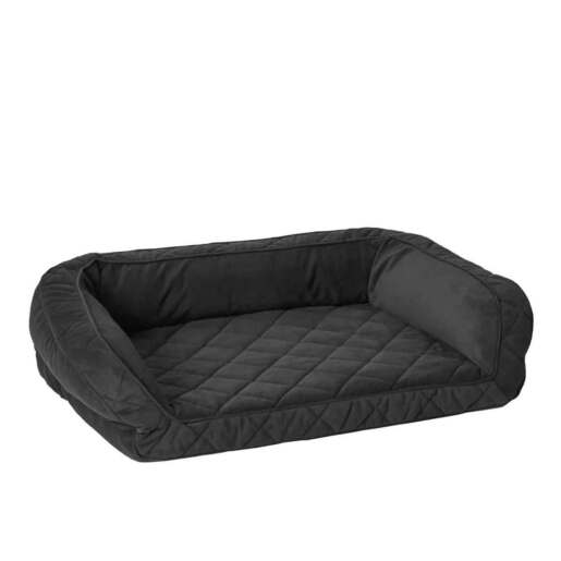 Orvis Couch Dog Bed - A cozy shape, a soft quilted sleep surface, and a streamlined bolster make the ComfortFill-Eco Couch one super-comfy dog bed. The springy and responsive ComfortFill-Eco cushion refuses to flatten or clump, no matter how much your dog moves around—perfect for dogs who nuzzle, nest, and burrow to get comfortable. The three-sided bolster provides security and support for dogs who prefer a place to lean or rest their head, while the one open side makes this bed easy for dogs of all ages to get on and off. The upholstery-grade cover is as durable as it is incredibly soft. Polyester cover is removable and washable. Personalize with embroidery, up to 15 characters. Imported. The Shape: Couch Designed to satisfy all sleep styles, this best-selling bed features a plush, streamlined, polyester-filled bolster that supports your dog and provides a sense of security The three-sided bolster makes a supportive backrest and comfortable place for your dog to lean or rest their head, while one open side makes for easy stretching out The low profile and open front make this bed easy for older dogs to get on and off The Cushion: ComfortFill-Eco The ComfortFill-Eco cushioning is made of recycled polyester that holds its loft and refuses to flatten. A chambered liner prevents the fill from clumping and shifting This springy cushion is best for dogs who prefer to dig, burrow, and nest to get comfortable The Cover: Quilted Upholstery Grade Fabric Durable, furniture-grade cover is quilted for extra comfort Zip-off cover is machine washable for easy cleanup Sizing Small: 35½in x 25½in full bed, 22½in x 20½in sleep surface, dogs up to 40 lbs. Medium: 40in x 26½in full bed, 28½in x 21½in sleep surface, dogs 40-60 lbs. Large: 44in x 31in full bed, 32½in x 25½in sleep surface, dogs 60-90 lbs. X-Large: 50in x 37in full bed, 39in x 32in sleep surface, dogs 90-120 lbs.