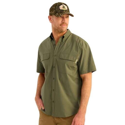 Nomad Men's Huntley Short-Sleeve Hunting Shirt - The Huntley Short-Sleeve Button-Down offers a perfect balance of comfort, functionality, and style. With 4-way stretch, laser perforated back for ventilation, security front pockets, interior eye wipe, and UPF 30+ sun protection, this shirt is engineered to perform during outdoor activities and active pursuits. 4 way stretch for enhanced mobility & comfort Targeted cooling perforated back for enhanced ventilation Security chest pockets for safe storage and convenient access Moisture transport to keep you cool & dry Interior eyewear wipe for glasses UPF 30+ Style: N1500054