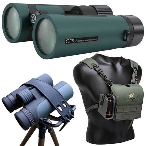 GPO Polariz Full-Size Binocular Bundle - 10x42 - The POLARIZ bundle of products is the ideal package for those needing a binocular, chest harness case and tripod adapter, all in one. The 10×42 binocular uses premium high-transmission lenses with GPO bright coatings, and the body is made from robust dual-hinge aluminum. The chest harness is a rugged cordura case with a fully adjustable back strap, and the tripod adapter is strap-cradle universal system, making all of these items the perfect bundle for your outdoor needs. Bundle Includes: Binocular - 10x42 Dual-Hinge SD Glass, GPObright High Transmission Coatings Quad-Connect Cordura Chest Harness with QD Handheld Rangefinder Case Strap/Cradle Binocular Tripod Adapter