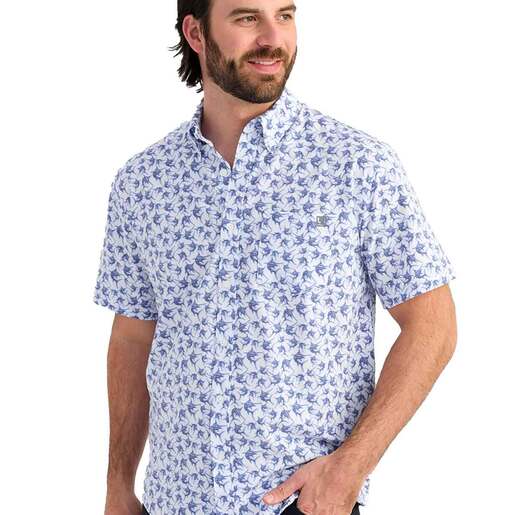 Huk Men's KC Kona Short-Sleeve Fishing Shirt - The Huk KC Scott Kona Button-Down Shirt is a versatile button-down designed for day-long use. Crafted of lightweight, breathable, quick-drying fabric with two-way stretch and a built-in microfiber sunglasses wipe, the Kona is optimized for comfort and convenience both on and off the water. Its design enables easy transition from boat to bar for an enjoyable day in the sun. 71% Polyester / 21% Cotton / 8% Spandex Style: H1500192