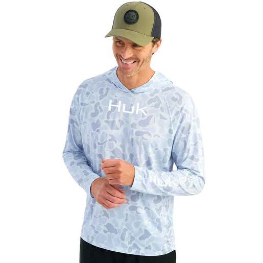 Huk Men's Airweight KC Printed Long Sleeve Fishing Shirt - Huk is stoked to introduce our newest technical fabric - the Airweight Collection. Made from ultra lightweight and soft material, this shirt is stacked with performance. Insane stretch allows unhindered casting and movement, the loose fit hood and UPF 40+ performance keeps you protected all day, the breathable and quick drying material keeps you cool and dry, and the anti-microbial treatment manages on-the-water smells when you get off the water. Side panel details Raglan sleeve for full range of casting motion Hooded for additional sun protection KC Scott exclusive artwork Anti-microbial Style: H1200719