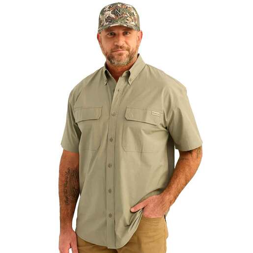 Nomad Men's Huntley Button Down Short-Sleeve Hunting Shirt - The Huntley Short-Sleeve Button-Down offers a perfect balance of comfort, functionality, and style. With 4-way stretch, laser perforated back for ventilation, security front pockets, interior eye wipe, and UPF 30+ sun protection, this shirt is engineered to perform during outdoor activities and active pursuits. 4 way stretch for enhanced mobility & comfort Targeted cooling perforated back for enhanced ventilation Security chest pockets for safe storage and convenient access Moisture transport to keep you cool & dry Interior eyewear wipe for glasses UPF 30+ suitable for outdoor adventures Style: N1500054