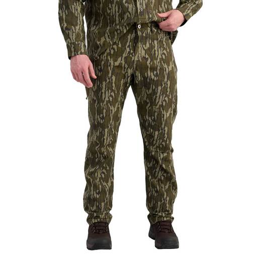 Nomad Men's Mossy Oak Bottomland Rub Line Field Hunting Pants - Old school vibes meet modern performance with the new Rub Line Collection. Made from durable, mid-weight cotton canvas with added stretch for ease of movement while kneeling or climbing a tree, the Rub Line Field Pant is at home with a grunt call nearby. This is the perfect kit for those hunters that love the comfort and silence that comes from cotton canvas but still want it to move with you throughout the hunt. Zippered Fly Cargo Pockets Durable Washed Canvas 98% Cotton/2% Spandex- Canvas Style: N2000084-922