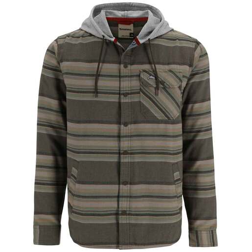 Simms Men's Santee Lightweight Flannel Shirt Jacket - Crafted from a planet-conscious blend of organic cotton and recycled polyester, welcome to the Santee Flannel Hoody — a lightweight woven flannel, with the warmth of a knit hood and traditional snap-front fit for wearing on and off the water. The lightweight brushed flannel is super soft to the touch but performs when moisture needs to be moved from the body A two-paneled hood, constructed from a french terry organic cotton and recycled polyester blend features a drawcord cinch to keep your noggin warm and ears covered Customized rubber-coated, snap front closure Snap-closure left chest pocket houses an accessory cord loop Two angled handwarmer pockets Double layered yoke extends over the shoulders for comfort and durability when wearing with bibs or waders Bias cut allows the fabric to naturally stretch and box pleat provides mobility Finished with a traditional shirttail hem Style: 13562