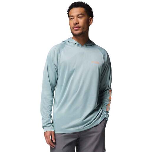 Columbia Men's PFG Terminal Tackle Hooded Long Sleeve Fishing Shirt - This classic sun hoodie is made for long days on the water with broad-spectrum UV protection, sweat-wicking tech, and quick-drying fabric for comfort from first light to last cast. Omni-Shade Broad Spectrum UPF 50 protects against skin damage using select fibers and fabrics to block a wider range of UVA/UVB rays, so you stay safer in the sun Omni-Wick keeps you dry and cool by pulling moisture to the fabric’s surface to evaporate, delivering fast-drying, next-to skin comfort in the heat Quick-drying treatment allows garments to dry faster by helping moisture escape from the surface of fabric, so you stay comfortable while being active Lightweight hood keeps the back of your neck and ears protected from the sun when pulled up Raglan sleeves for a full range of motion while casting Style: 1536171