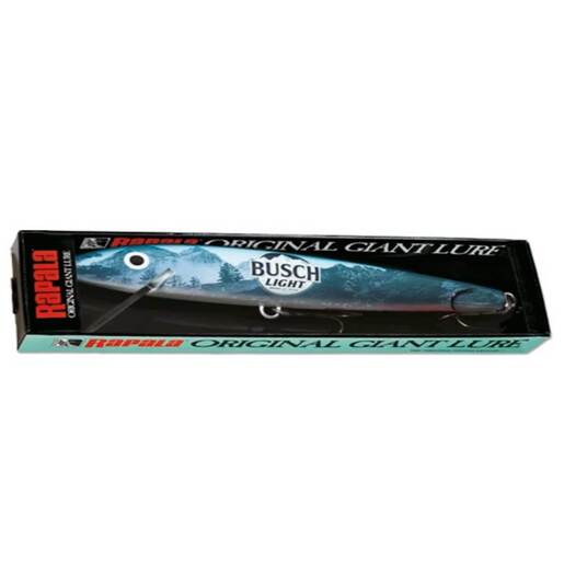 Rapala 29in Giant Lure Replica Decoration - Busch Light - The Rapala Giant Lure Replica come in at a substantial 29 inches (74 cm) in length, this "lure" is not designed for fishing but rather as a striking decorative piece, making it a focal point in any room or display! Instant storytelling erupts every time anglers get near this massive replica of America's favorite lure. Makes a natural centerpiece in a woodsy bar setting, any basement, rec-room, log cabin or office. Packaged in a giant original style Rapala lure carton with the legendary Rapala story on the back. Constructed from a durable hard plastic material with a high-quality finish, this ensures it maintains its aesthetic appeal over time as a static display item. Perfect for avid fishermen who appreciate fishing heritage, as well as collectors looking for unique and thematic decor for their homes, offices, cabins, or tackle rooms! It replicates the iconic design and details of a classic Rapala fishing lure, scaled up significantly, showcasing the brand's recognizable shape & even the signature wobbling lip. Coming in an Oversized Classic Rapala Box and Equipped with 2 Giant Treble Hooks for added flare, the Rapala Giant Lure Replica Decoration is a must have for any hobbyist or collector! Secure one of 2 colors today!