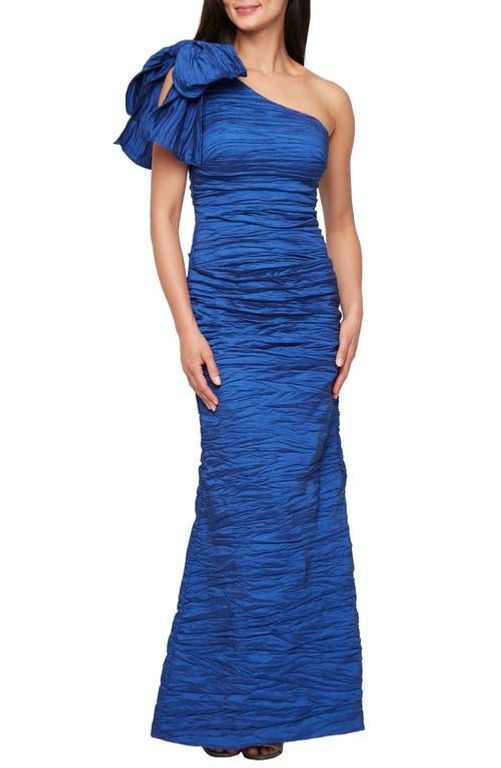 Bow Detail One-Shoulder Ruched Satin Gown - Blue - Alex Evenings Dresses