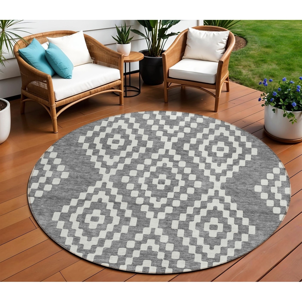 8' Gray And Ivory Round Geometric Washable Indoor Outdoor Area Rug - 7' x 7' Round