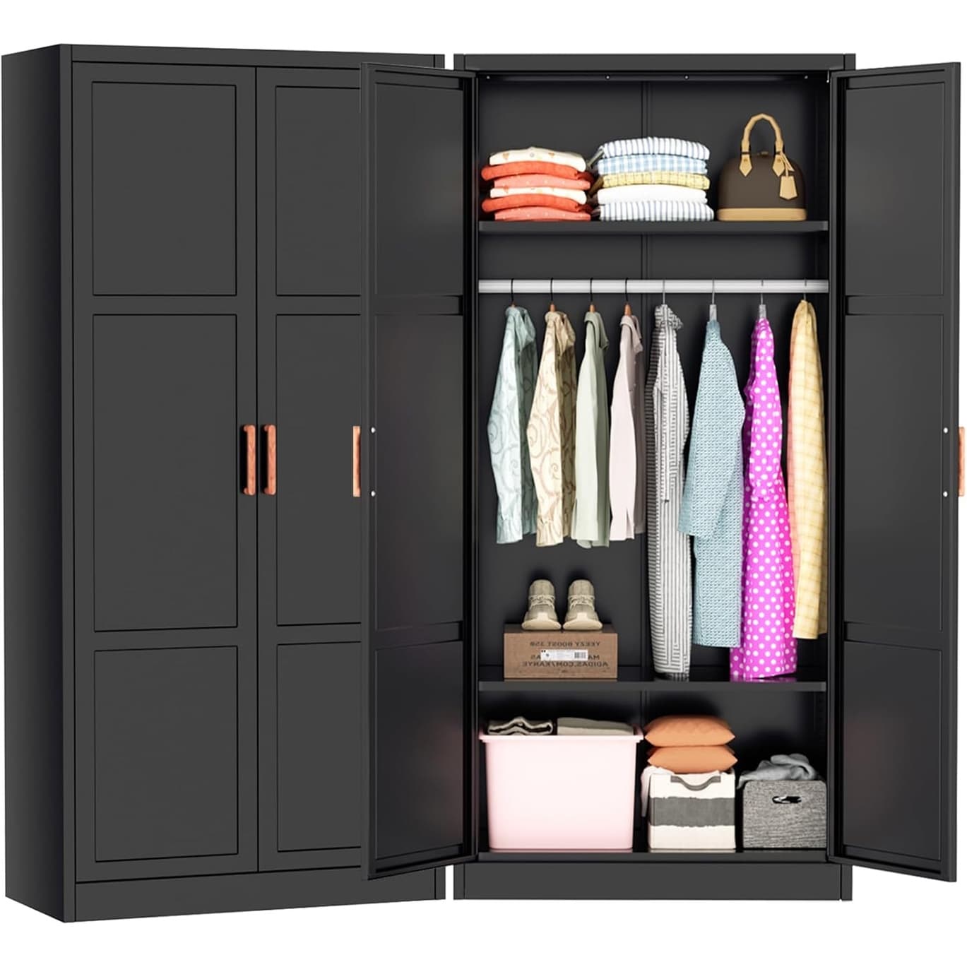72 Inch Black Metal Wardrobe Cabinet with Wooden Handle, Hanging Rods & Adjustable Shelves for Bedroom Storage