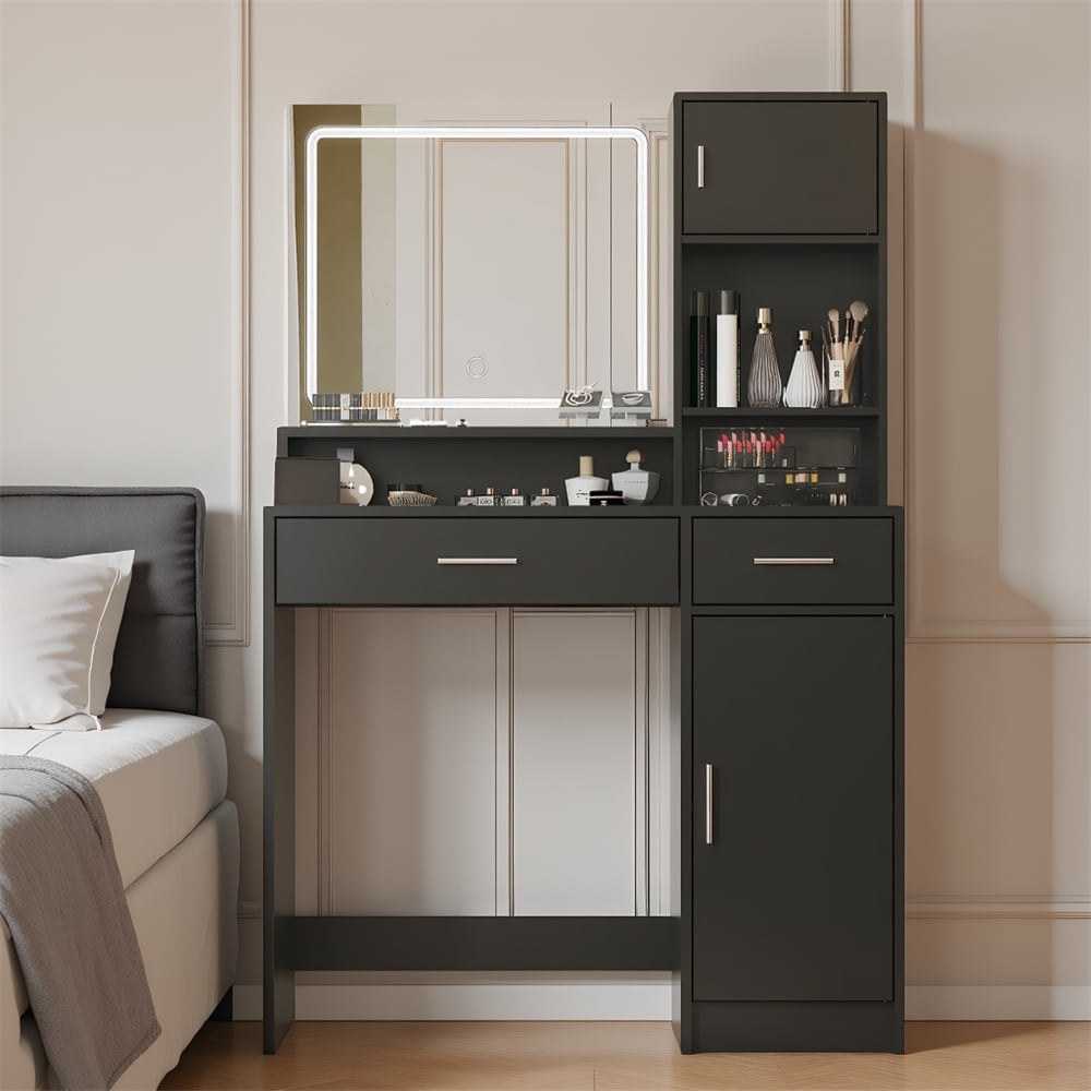 3-Color LED Vanity Mirror with Stool, 2 Drawers & 5 Storage Cabinets (4 Open + 1 Hidden), Adjustable Lighting